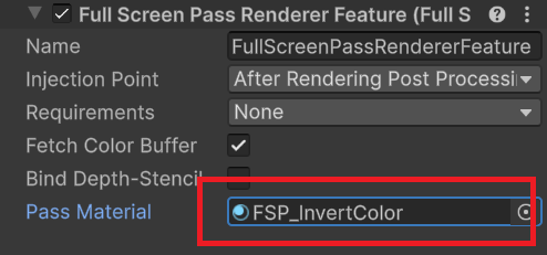 作成したFullScreen/FSP_InvertColorシェーダーをマテリアルから指定して、