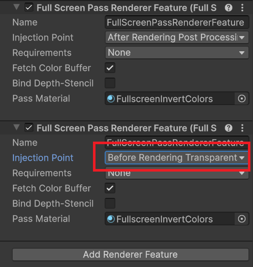 もしCameraのStack処理で複数Canvas描画している際は、もう一つFull Screen Pass Renderer Featureを追加します。
